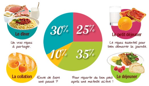Une alimentation équilibrée comporte 3 repas principaux : le petit-déjeuner, le déjeuner et le dîner, et une ou deux collations. Le premier temps de repas apporte 20 à 25 % des calories de la journée, le déjeuner 35 à 40 % et le dîner 30 à 35 %.
